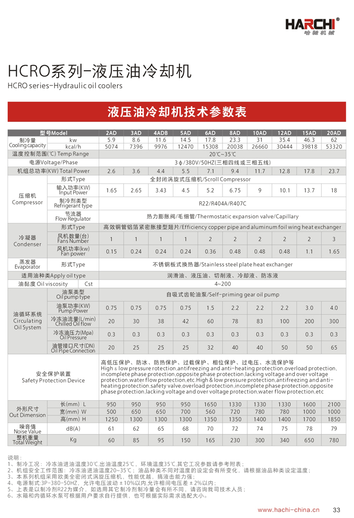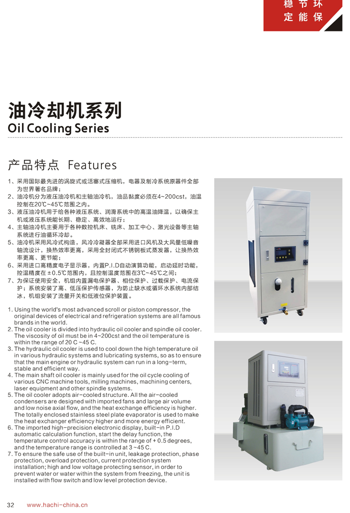 1、制冷能力是在環(huán)境溫度35℃,進(jìn)油溫度35℃,出油溫度30℃,油品為ISO VG32條件下測得。 2、用戶在選擇油冷機(jī)時(shí),必須選擇油液需控制的溫度范圍(1)18℃-25℃ (2)25℃-35℃ (3)35℃-45℃ (4)45℃以上。本公司推薦液壓油合理的溫度控制范圍為35℃-45℃. 3、油冷機(jī)吸油口必須用硬管連接,且加裝過濾器。 4、吸油管長度不應(yīng)超過1.5米,如超出必須加粗吸油口。 5、油冷機(jī)吸油口應(yīng)靠近設(shè)備回油口,出油口應(yīng)靠近設(shè)備供油口。 6、如吸油口太長,需將油泵與機(jī)組分離。 7、以上機(jī)組使用環(huán)境為5~42℃,42℃以上屬高溫機(jī)組,外形尺寸及相關(guān)參數(shù)會(huì)有所變更,請選型時(shí)注意。 8、參數(shù)表內(nèi)為本公司標(biāo)準(zhǔn)機(jī)型,本公司接受客戶特殊訂貨。 適用種類: ◇ CNC車床、銑床、磨床、拉床 ◇ CNC旋轉(zhuǎn)臺、油壓機(jī)、木工雕刻機(jī) ◇ CNC立式/臥式加工中心、綜合切削加工中心 ◇ 高速機(jī)械主軸、電主軸、靜壓(動(dòng)靜壓)主軸 ◇ 各種機(jī)械的液壓站及潤滑系統(tǒng) ◇ 放電加工設(shè)備.